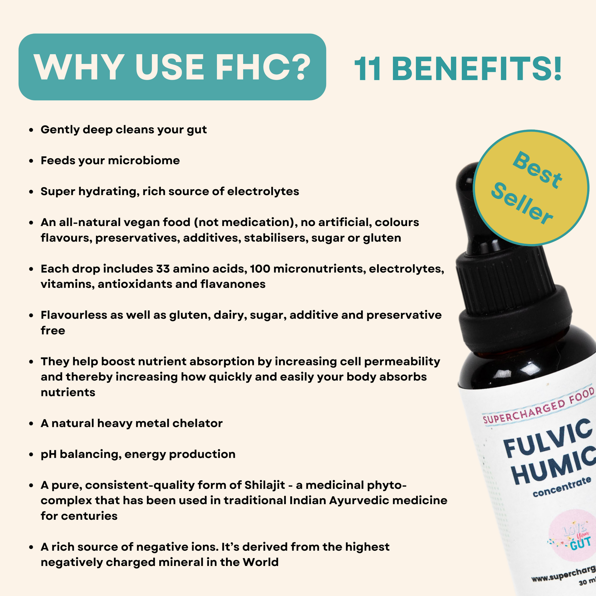 Love Your Gut Fulvic Humic Concentrate (FHC) drops contains humic and fulvic acids, which are natural organic plant substances that play an important role in deep cleaning the tight junctures of your gut.
